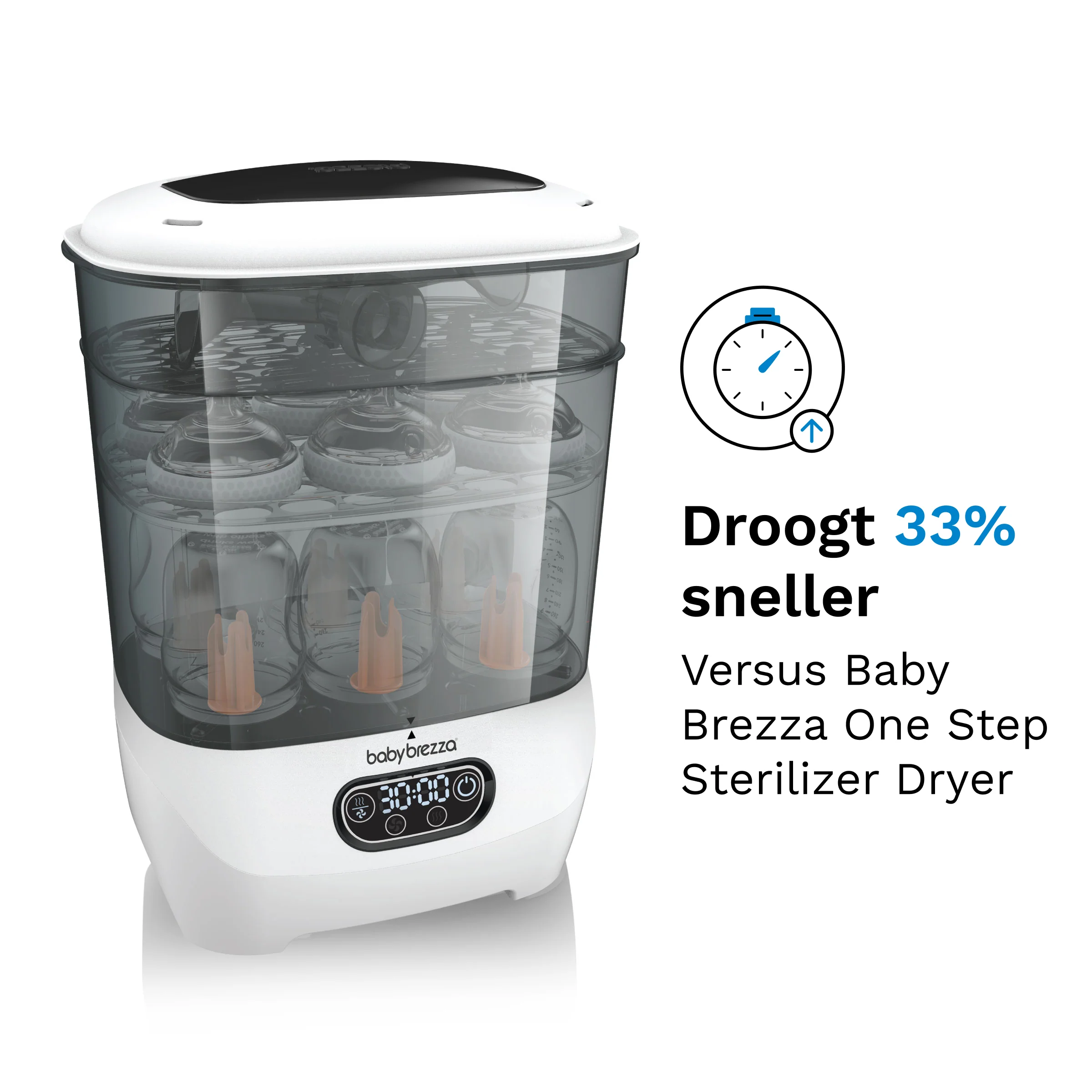 - Automatisch steriliseren én 33% sneller drogen – alles in één eenvoudige stap: geschikt voor flessen, borstkolfonderdelen, fopspenen, bijtringen, tuitbekers en andere accessoires van elk merk. Droogt in slechts 30 minuten in plaats van 45 minuten bij andere apparaten.